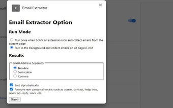 O Email Extractor é uma extensão para o Chrome que permite coletar endereços de e-mail de páginas da web visitadas. Com uma interface simples, o usuário pode ativar a coleta de e-mails diretamente do ícone da extensão, que oferece dois modos de operação: 'uma vez' e 'em segundo plano'. No modo 'uma vez', ao clicar no ícone, a extensão coleta todos os e-mails da aba ativa e os copia para a área de transferência. Já no modo 'em segundo plano', a coleta é contínua e para ao clicar novamente no ícone, copiando todos os e-mails coletados.